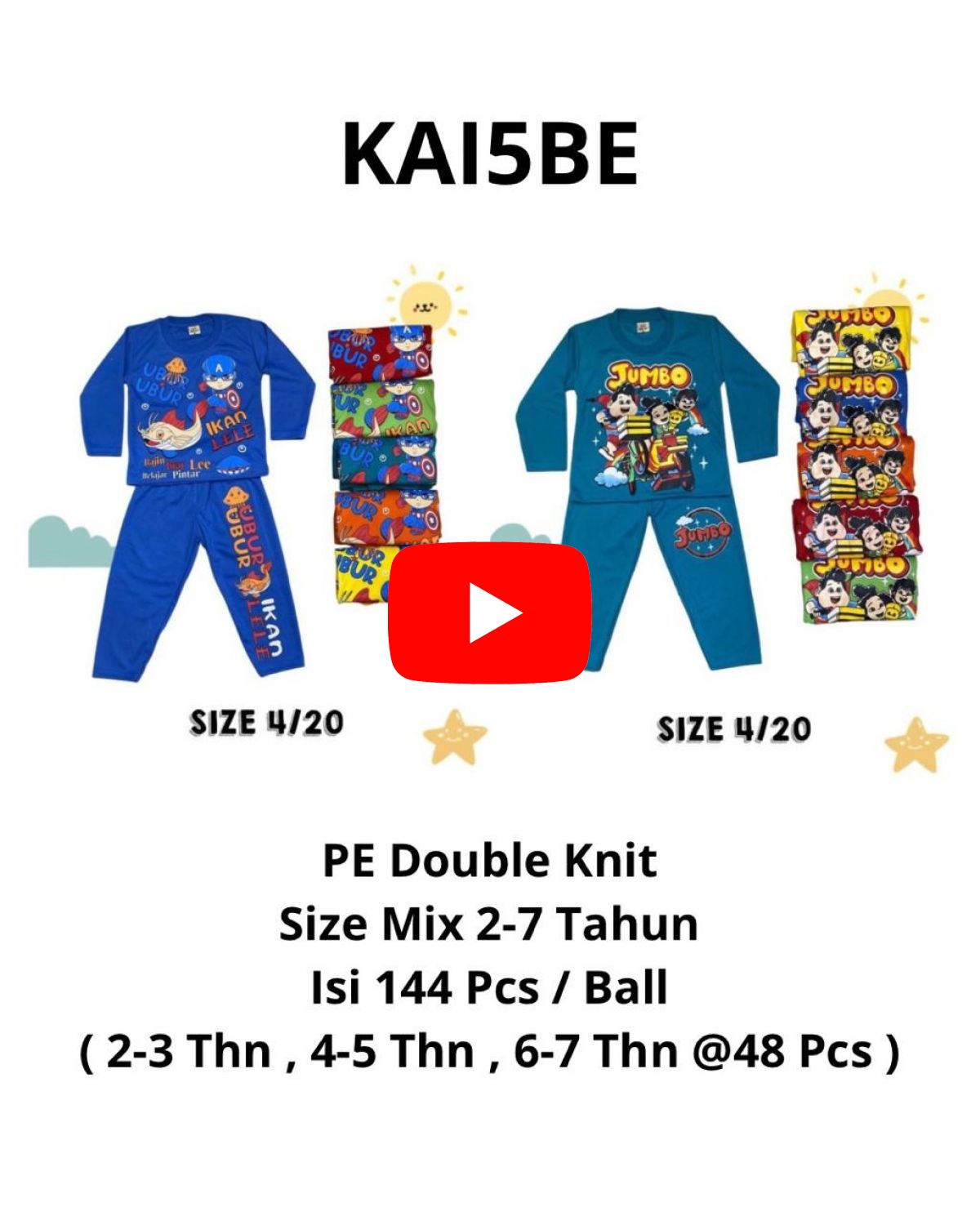 BAJU ANAK KAI5BE BAHAN PE DOUBLE KNIT SIZE MIX 2-7 TAHUN ( 2-3 THN , 4-5 THN , 6-7 THN @48 PCS ) ISI 144 PCS
