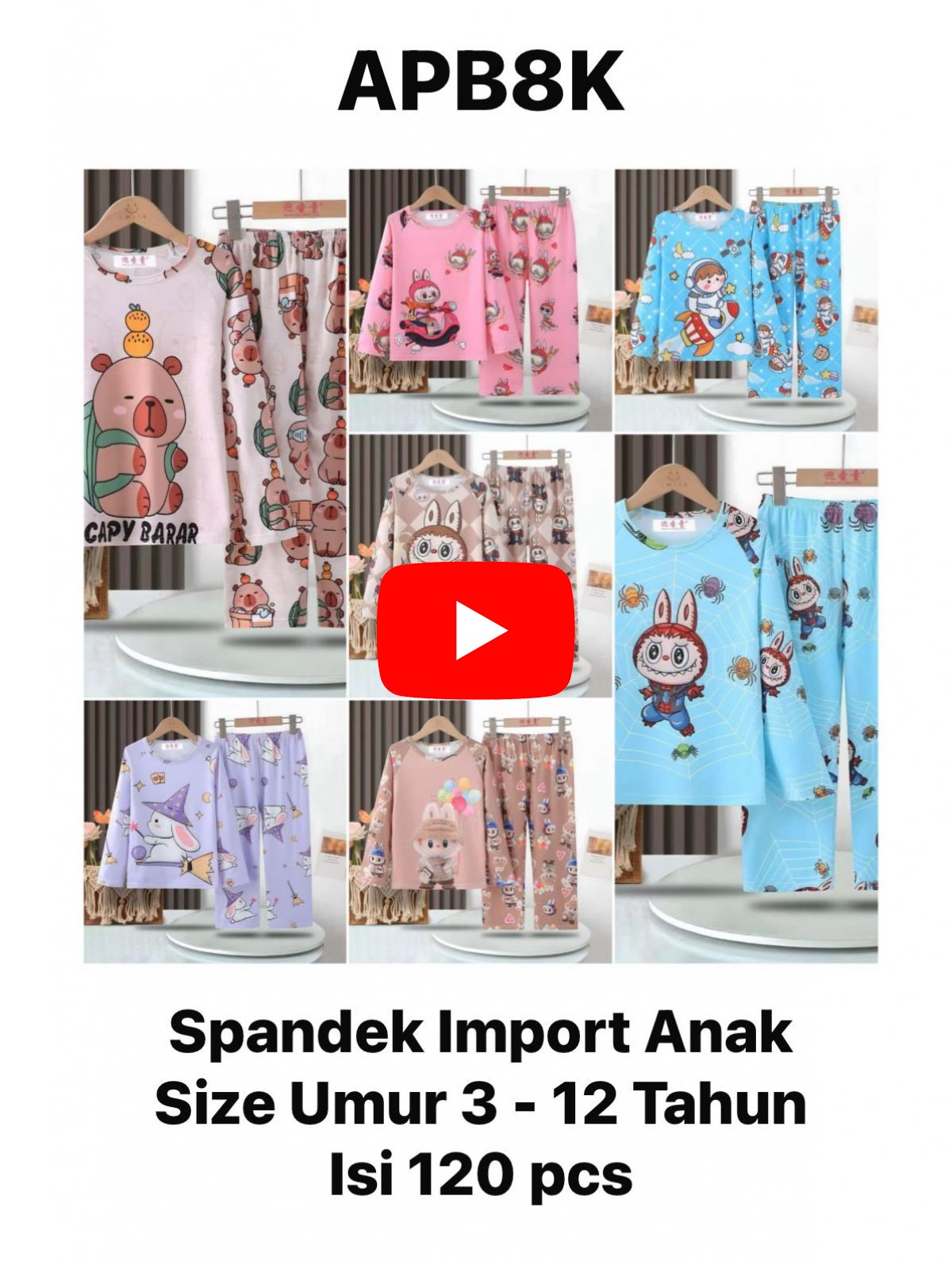 BAJU TIDUR ANAK SPANDEK IMPORT APB8K SIZE UMUR 3 - 12 TAHUN ISI 120 PCS.