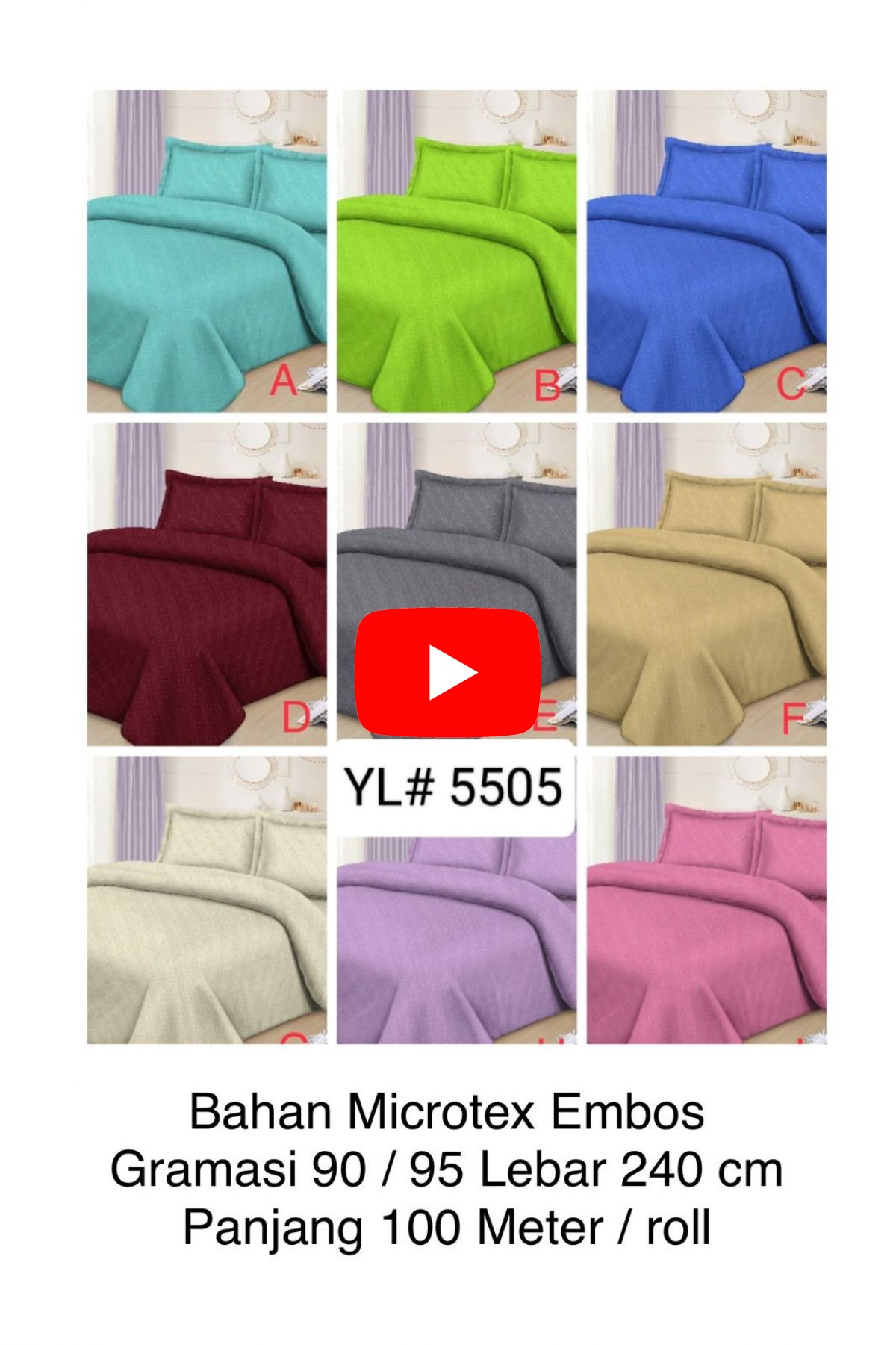 BAHAN SPREI MICROTEX EMBOS YL5505 GRAMASI 90 / 95 LEBAR 240CM PANJANG 100 M / ROLL ( TERDAPAT 9 WARNA YANG DAPAT DIPILIH & TOLONG SERTAKAN HURUF PADA WARNA YANG DI PILIH PADA SAAT PEMESANAN )BAHAN SPREI 1 ROLL = 100 METER Stock = 10 ROLL
