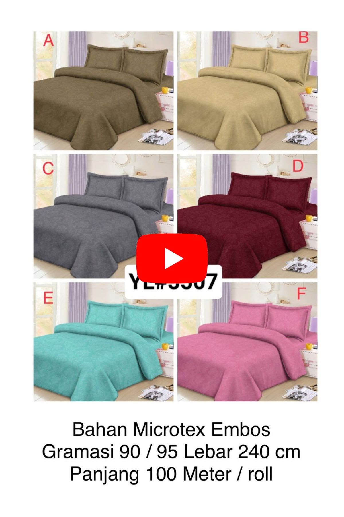 BAHAN SPREI MICROTEX EMBOS YL5507 GRAMASI 90 / 95 LEBAR 240CM PANJANG 100 M / ROLL ( TERDAPAT 6 WARNA YANG DAPAT DIPILIH & TOLONG SERTAKAN HURUF PADA WARNA YANG DI PILIH PADA SAAT PEMESANAN )BAHAN SPREI 1 ROLL = 100 METER Stock = 10 ROLL