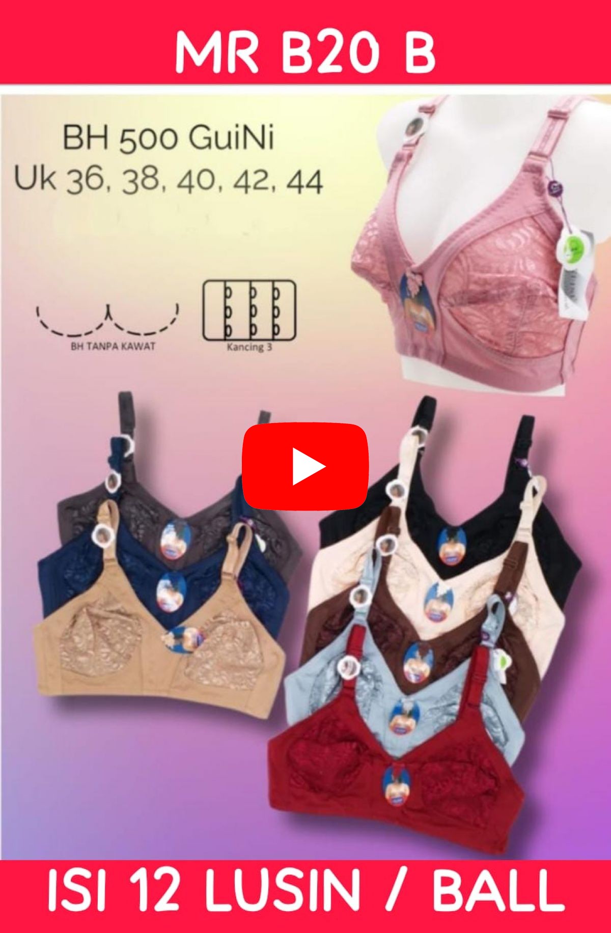 BH TANPA KAWAT KANCING 3 MR B20 B SIZE 36 - 44 ISI 12 LUSIN