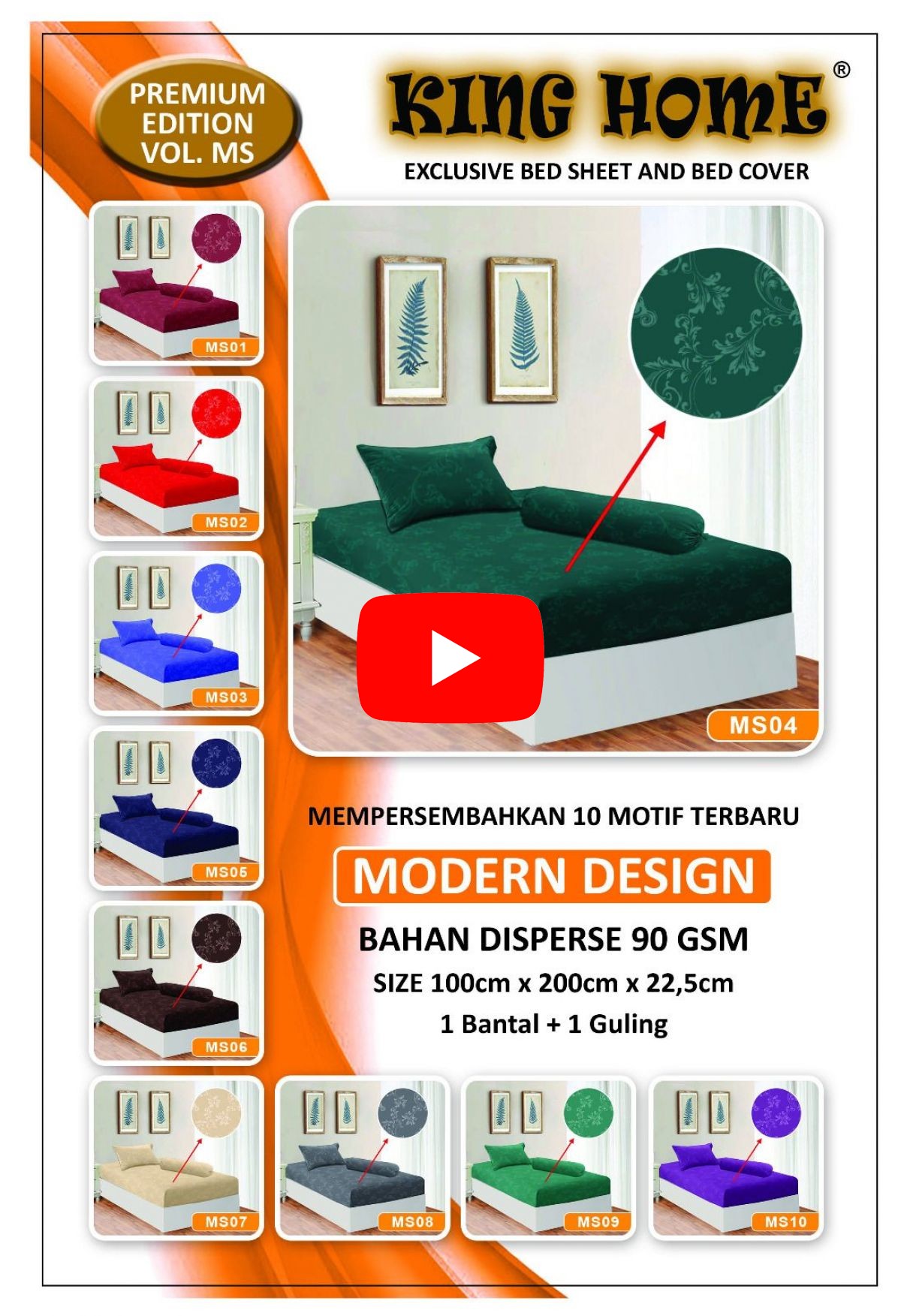 SPREI KING HOME MS100E EMBOS ISI 100 PCS BAHAN DISPERSE 90 GSM SIZE 100CM * 200CM * T22,5CM 1 BANTAL + 1 GULING